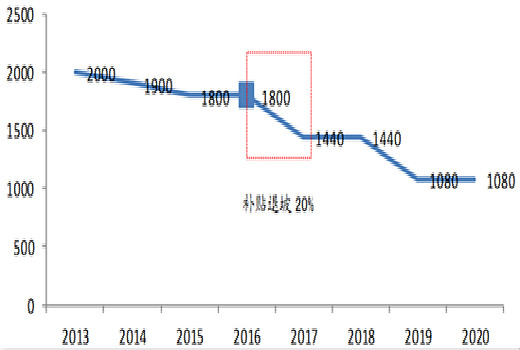 2013 到 2020 年純電動(dòng)商用車補(bǔ)貼退坡(單位:元/kwh)